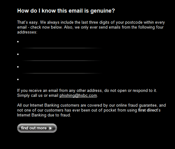This is a cracker, my bank decided to warn me against phishing attacks and watch out for dodgy emails that claim to be First Direct. ![]() Then look how they re-assured me that this email is genuine... ![]() ...even the big boys get it wrong |