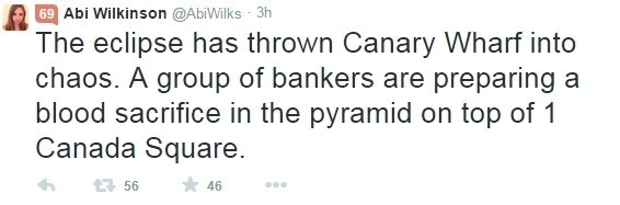 “You miserable lot! I thought the solar eclipse was awesome! It was sunny here and I had the proper glasses so you could see the moon passing across.”